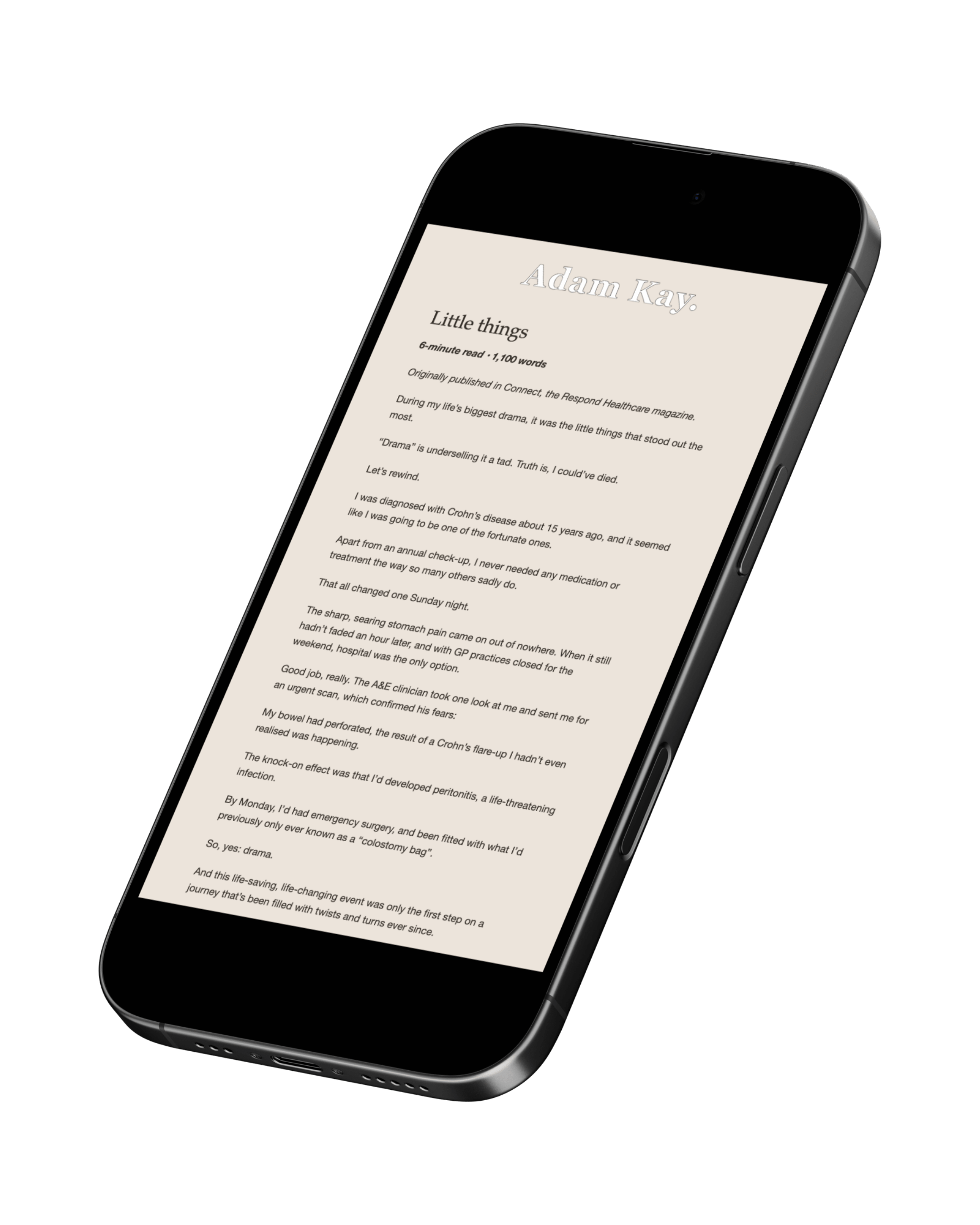 I live with a stoma and Crohn’s disease. I love anything creative. And I’ve been a full-time writer for well over a decade now. But you need to know something else as well: